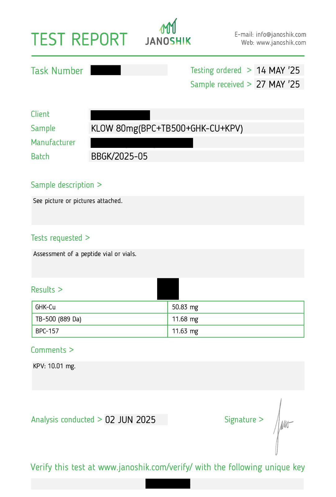 The KLOW blend is not approved by the U.S. Food and Drug Administration for human use. Its safety, efficacy, and pharmacological profile have not been established in approved FDA clinical trials. This compound is intended strictly for laboratory research purposes and is not for human or veterinary use.